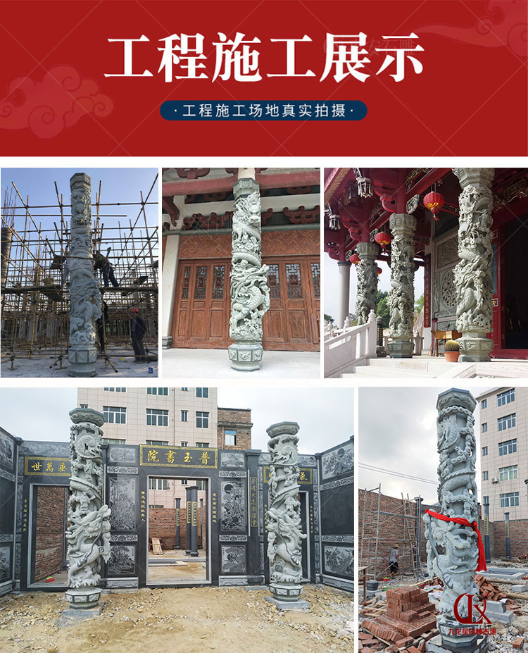 福建廠石雕龍柱產(chǎn)品構成為柱礎、柱身、柱頭(柱帽)三部分,龍柱一般為圓柱形,通身雕刻有纏柱云龍,適用于宮觀寺院、宗祠古厝、園林景觀、廣場擺件等,常用石料為花崗巖與青石。